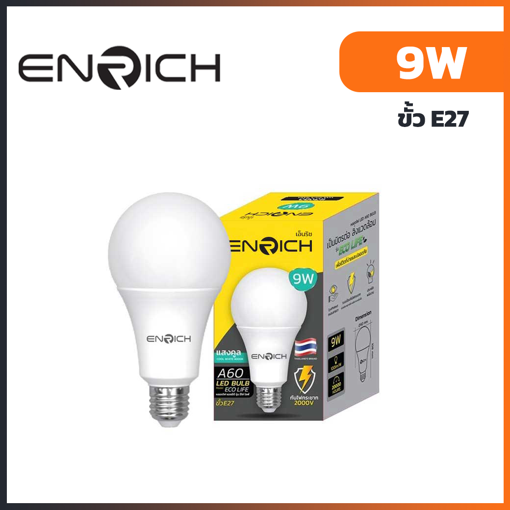 หลอดไฟ LED 9W ENRICH ECO LIFE ขั้ว E27 ความสว่าง 900lm สามารถถอดเปลี่ยนกับของเก่าได้เลย มีแสงให้เลือกแสง 3 คือ แสงเหลือง (Warm White) แสงขาวนวล (Cool White) และแสงขาว (Daylight) แสงสว่างกระจายเต็มพื้นที่ เหมาะสำหรับติดตั้งภายในตัวอาคารเช่น ภายในอาคารบ้านเรือน ออฟฟิต โรงเรียน โรงพยาบาล สำนักงานต่างๆ เป็นต้น หลอดไฟ LED จะไม่มีการปล่อยรังสีที่เป็นอัตรายออกมา เช่น รังสี UV รังสีอินฟาเรด นอกจากนี้ยังปล่อยความร้อนออกมาน้อยมาก จึงทำให้มีอายุการใช้งานยาวนานมากกว่าหลอดไส้และหลอดฟลูออเรสเซนต์ จึงทำให้ไม่ต้องเปลี่ยนหลอดไฟบ่อยๆ ระบบป้องกันไฟกระชาก 2000V หมดห่วงเรื่องไฟกระชาก มีการรับประกันสินค้า 1 ปี อายุการใช้งาน 20,000 ชั่วโมง ได้รับมาตรฐานมอก.1955-2551 และ มอก.2780-2562