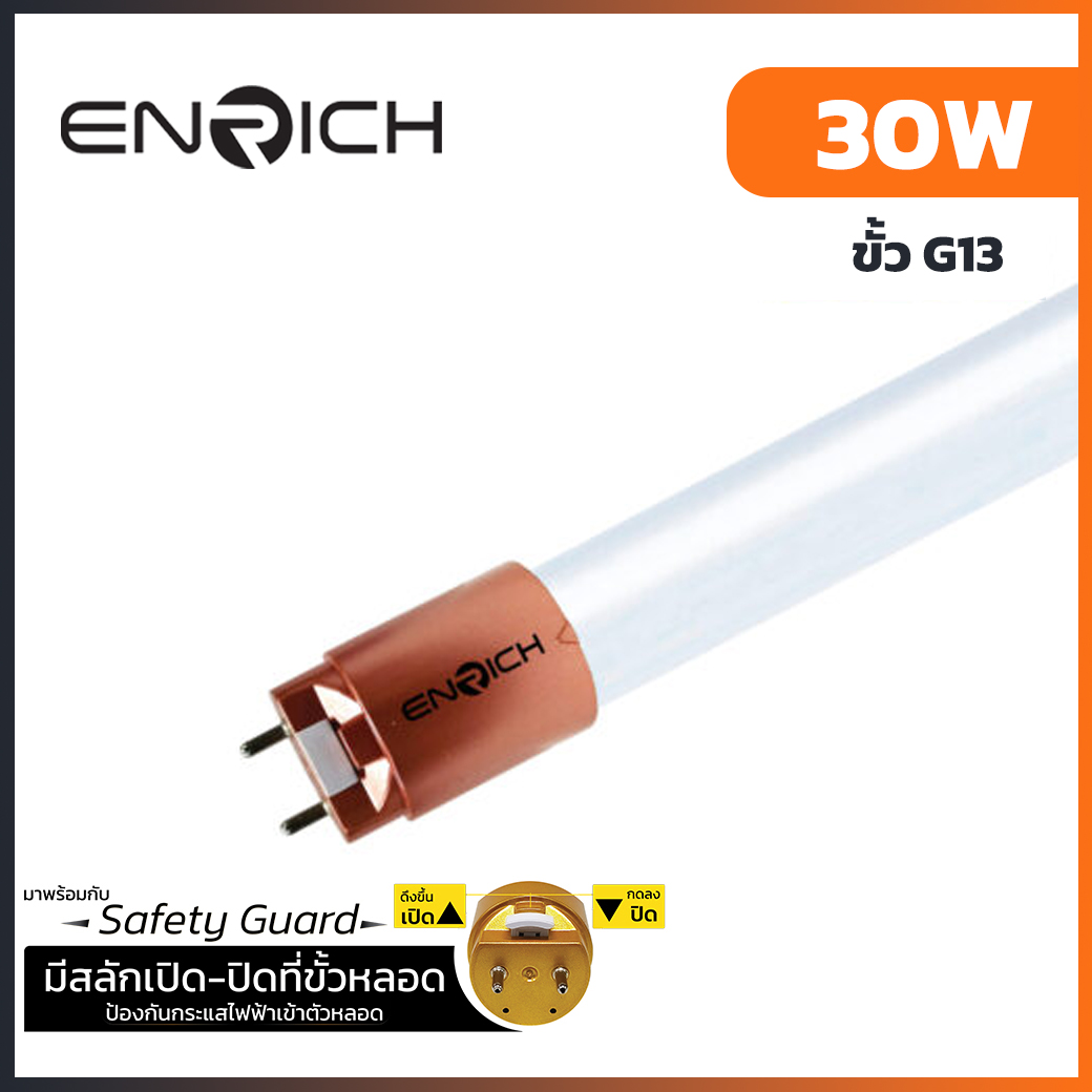 หลอดไฟ LED T8 30W ENRICH BRIGHTER แสงขาว 6500K Daylight ติดตั้งง่ายใช้กับชุดรางไฟได้ทั้งแบบขาบิดล็อก และแบบขาสปริงใช้การต่อวงจรแบบ (Double End) ไฟเข้าได้ 2 ทางเท่านั้น เหมาะสำหรับติดตั้งในที่พักอาศัย โรงแรม สำนักงาน ประหยัดพลังงานมากกว่าหลอดไฟแบบธรรมดาหลายเท่า มีระบบป้องกันไฟกระชาก 1200V กันน้ำและฝุ่นมาตรฐาน IP20 มีระบบป้องกัน Safety Guard อายุการใช้งานยาวนาน 30,000 ชั่วโมง